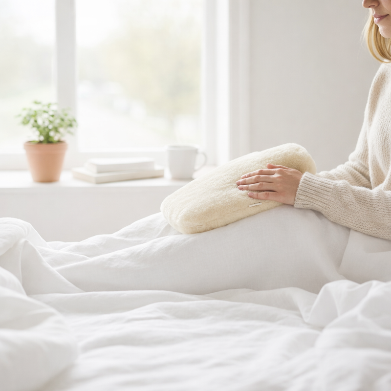 Not a rubber bottle. A premium sheepskin solution. Holds warmth for hours with steady comfort. Designed for cramps, cold nights, and real relief.